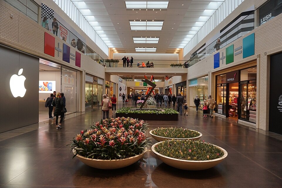 One notable feature is CenterPark, a landscaped outdoor garden area located at the heart of the shopping complex. Surrounded by mature oak trees, walking paths, and seasonal flowers, the space provides a peaceful retreat from the energy of the retail floors.